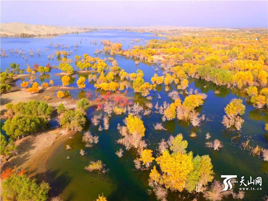 航拍下的胡杨金黄树叶色动人。
