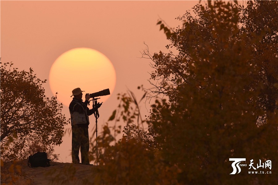 2016年10月30日,在沙漠朝阳的照射下,一位摄影师在寻找美的景色。