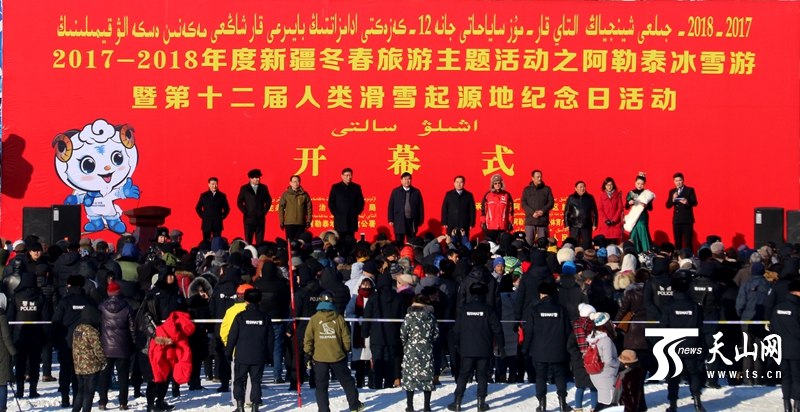 天山网阿勒泰讯(记者崔导胜 孙健摄影报道)1月16日下午,2017-2018年度新疆冬春旅游主题活动之阿勒泰冰雪游暨第十二届人类滑雪起源地纪念日活动在阿勒泰市将军山滑雪场激情开幕,来自国内外游客和当地群众五千余人在这里尽享冰雪乐趣。